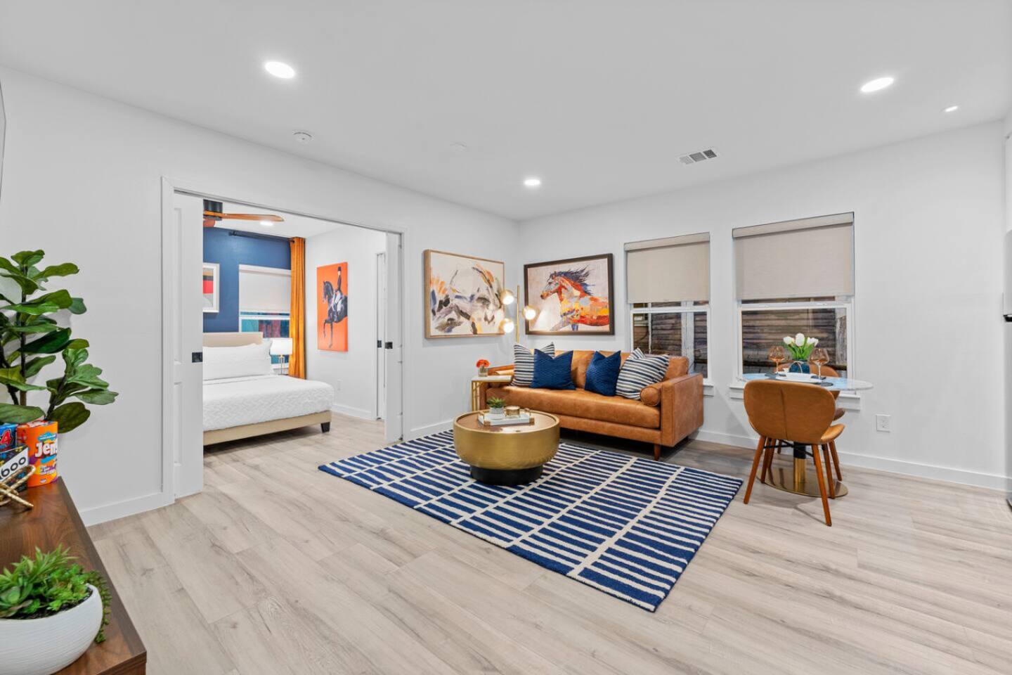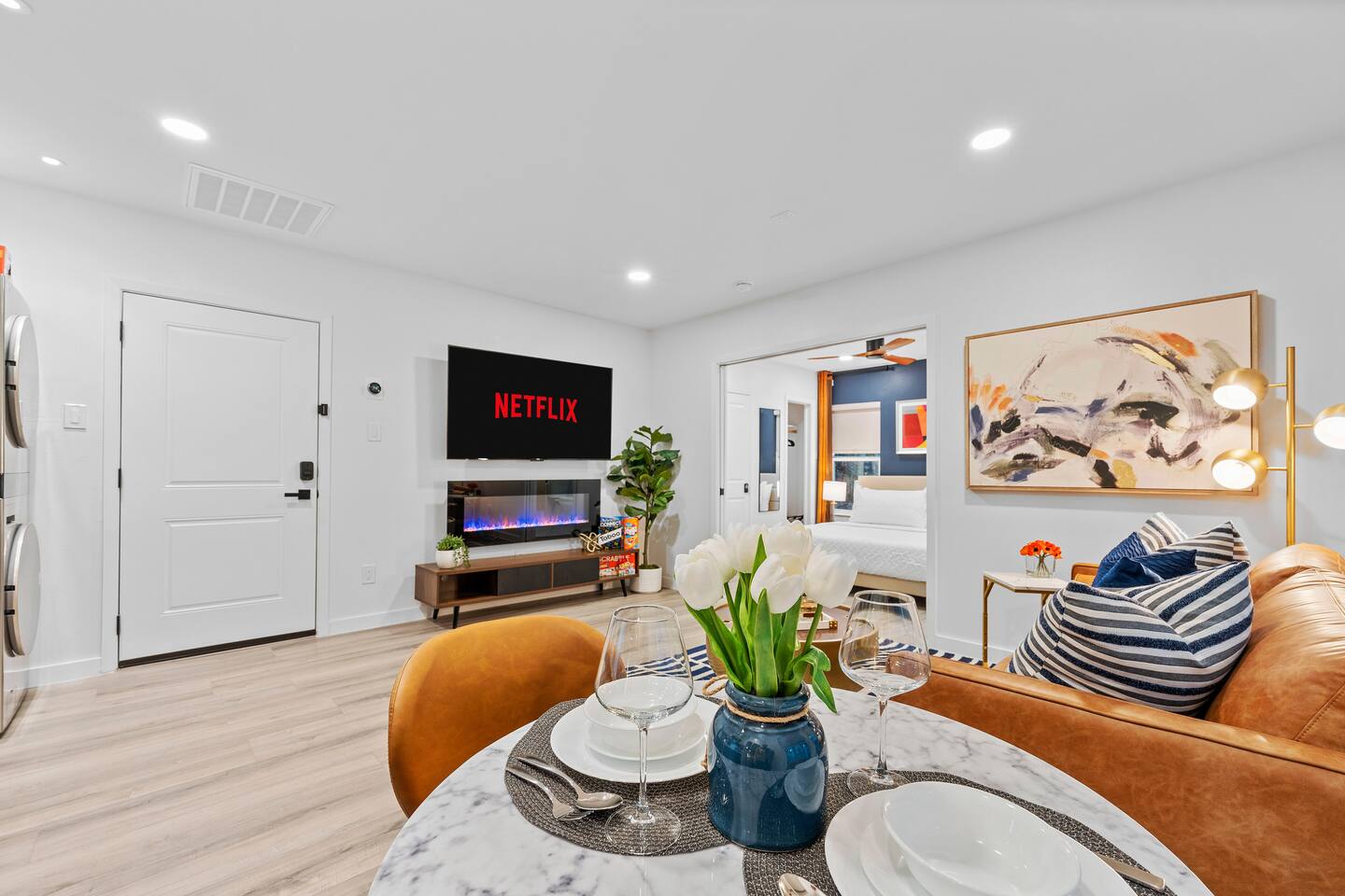 Welcome to your Modern 1BR apartment retreat in the heart of the Bishop Arts District near Downtown Dallas, where bold color, warm textures & walkable Dallas charm come together for a stay full of comfort and creativity ★Sleeps 4 | 1 Bedroom | 1 King Bed + Air Mattress | 1 Bath ★Putting green, Backyard Games ★Free & Gated Parking options* ★Living: 55” Roku TV, Bedroom: 32" ★ Electric Fireplace ★Fully equipped kitchen ★Dedicated workspace, Fast WiFi ★Flex Checkin/Checkout options, Self Check-in