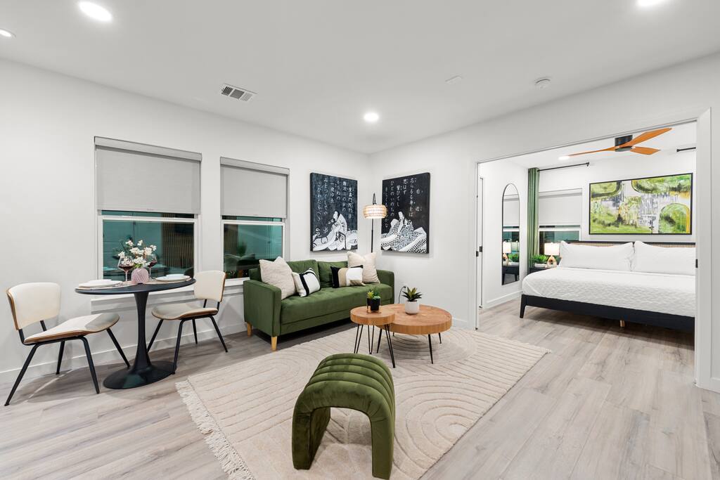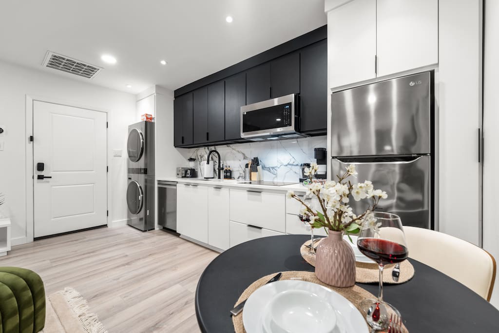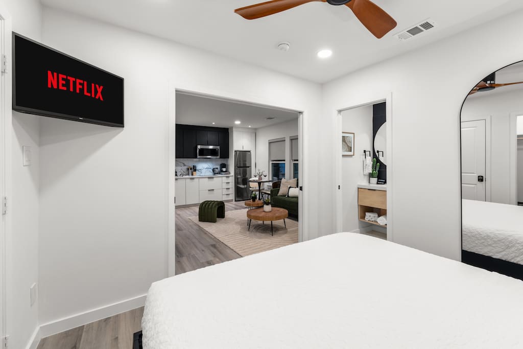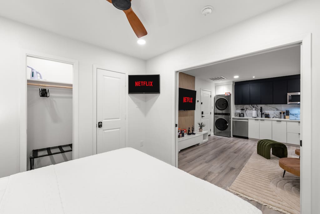 Morning light filters through soft linen curtains as you ease into the day. A quiet calm fills the space, where simplicity meets warmth in a soothing blend of Scandinavian and Japanese design. Here, you can slow your pace—brew coffee in a thoughtfully equipped kitchen, curl up on the sofa with a book or a favorite show, and feel a sense of balance throughout your stay in Dallas’s Bishop Arts District. Sleeping arrangements The bedroom offers a king bed with premium linens and a second Smart TV, designed for restful nights after exploring the neighborhood. A queen air mattress is available for additional guests, comfortably accommodating up to four. Room-darkening shades, reading lamps, and extra pillows and blankets add to your comfort. Living space The open-concept living area welcomes you to unwind. A comfortable sofa and coffee table invite slow evenings with Netflix or board games under warm lighting. Every corner of the apartment reflects the Japandi theme—clean lines, soft tones, and purposeful calm. Kitchen & dining Cook and dine with ease in the fully equipped kitchen featuring an LG refrigerator, induction stove, convection microwave oven, dishwasher, Keurig coffee maker, and hot water kettle. Essential cookware and tableware are provided, and a dining table for two offers a simple spot to enjoy meals together. Bathroom Refresh in the walk-in glass shower stocked with bathroom essentials including shampoo, conditioner, body soap, and shower gel. Towels, a hair dryer, and cleaning supplies are available to make your stay effortless. Amenities The apartment includes high-speed Wi-Fi, a dedicated workspace, and central air conditioning and heating. A washer and dryer are provided for your convenience, and guests staying longer than 28 days are welcome. For families, a Pack ’n Play is available upon request. Self check-in is seamless with a smart lock. Parking & facilities You’ll have free driveway parking for one vehicle and access to free street parking nearby. Optional secure gated parking is available for $9 per day, and a Level 2 EV charger (220 volts, 12–35 miles per hour) can be added for $25 per day. The property also offers a shared putting green for a lighthearted moment outdoors. Neighborhood Set in the heart of the Bishop Arts District, you’re surrounded by galleries, cafés, and locally owned restaurants just minutes away. Stroll through streets filled with murals and vintage storefronts, or explore nearby attractions like the Dallas Zoo, Reunion Tower, and the Dallas Museum of Art, all within a short drive.