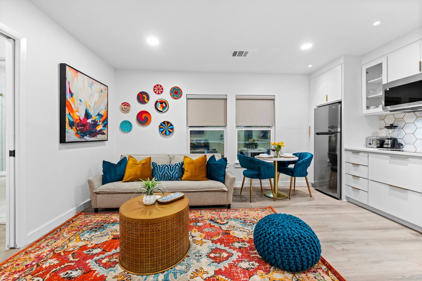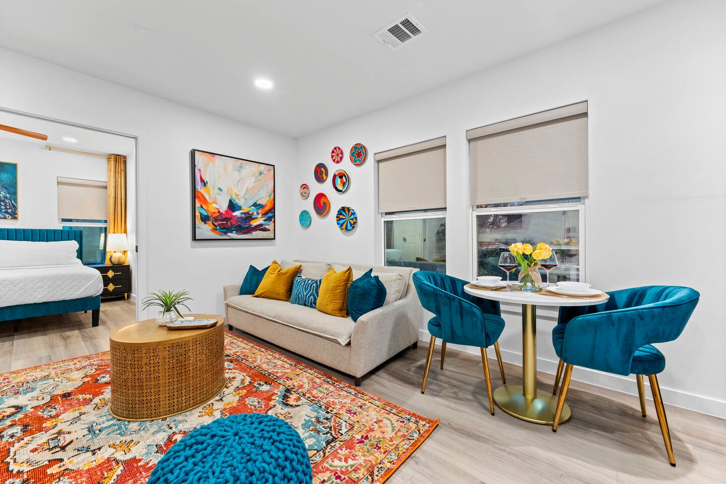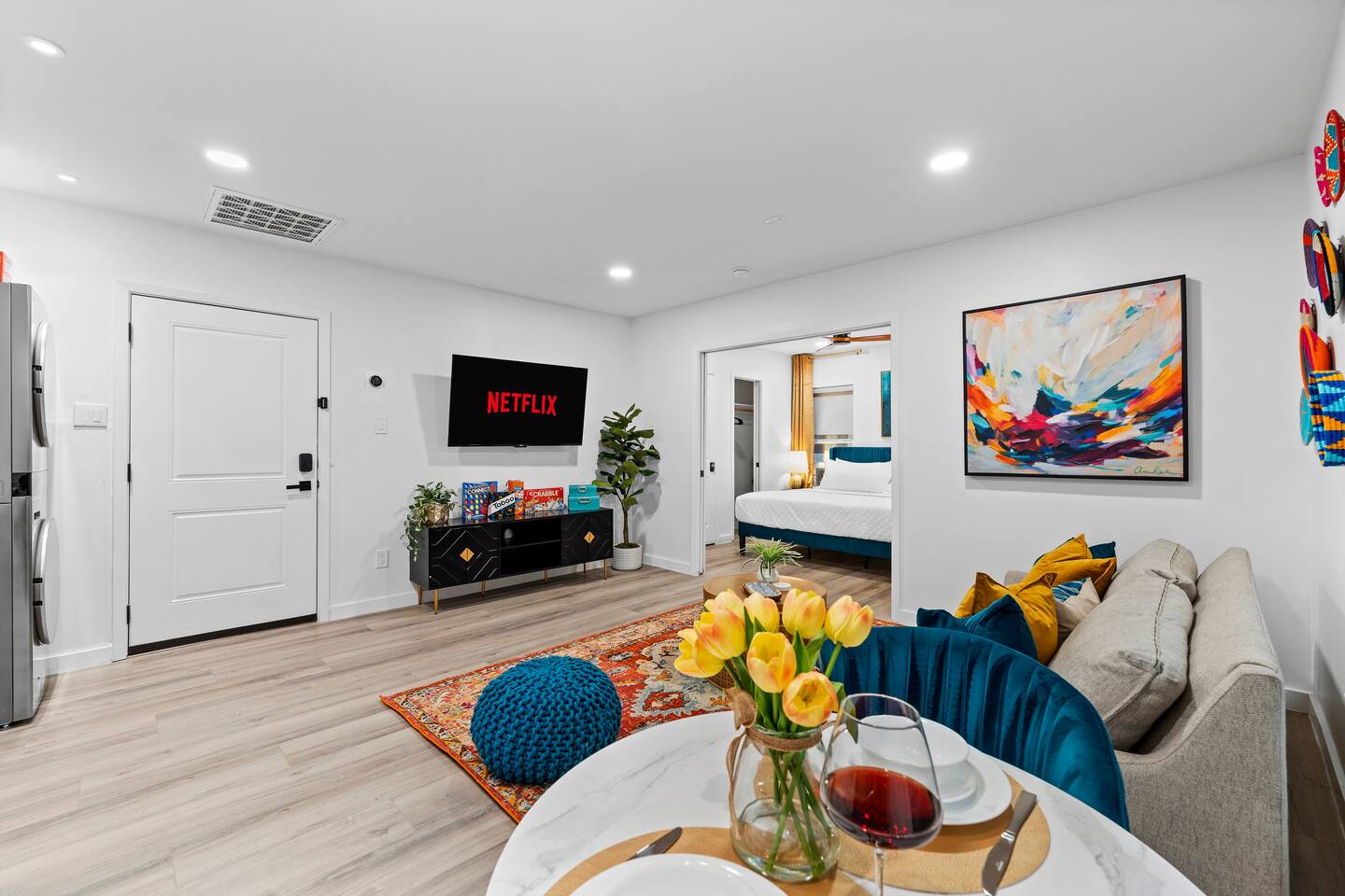 Welcome to a Moroccan-inspired retreat with warm textures in the heart of Bishop Arts District, minutes from Downtown Dallas. Perfect for weekend getaways, staycations, and longer stays. ★ Sleeps 4 | 1 Bedroom | 1 Bath ★ King bed + queen sofa bed ★ Fast WiFi, dedicated workspace ★ Free driveway/street parking ★ Self check-in (smart lock) ★ Gated community, putting green, backyard games ★ Fully equipped kitchen ★ 🧺In-unit washer/dryer ★ 55” Roku TV liv + 32” ★ Early check-in/late check-out opt