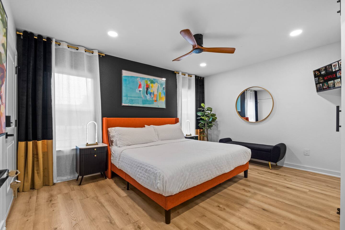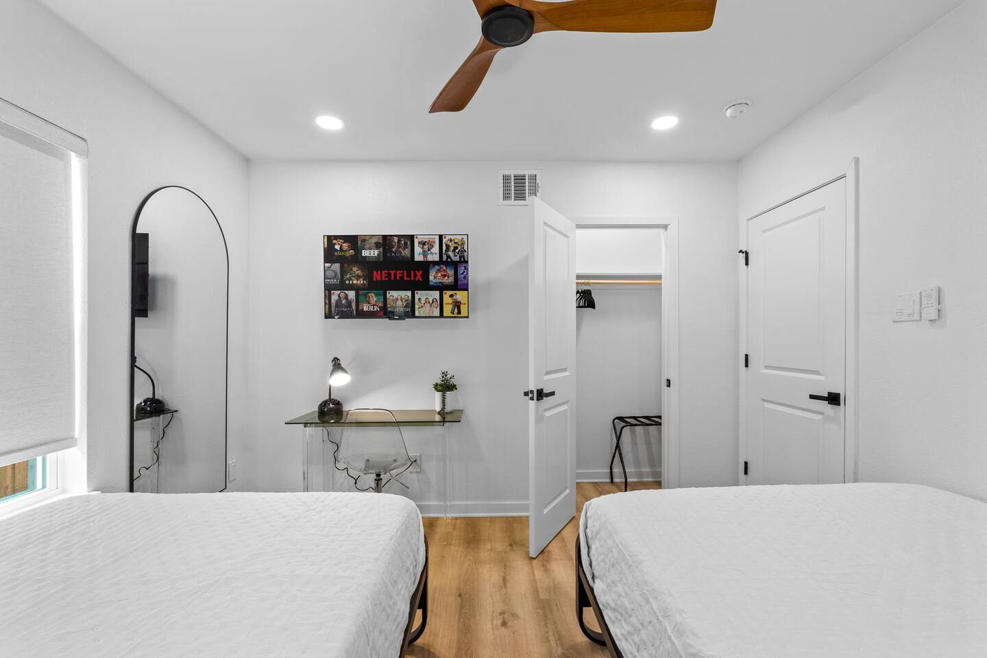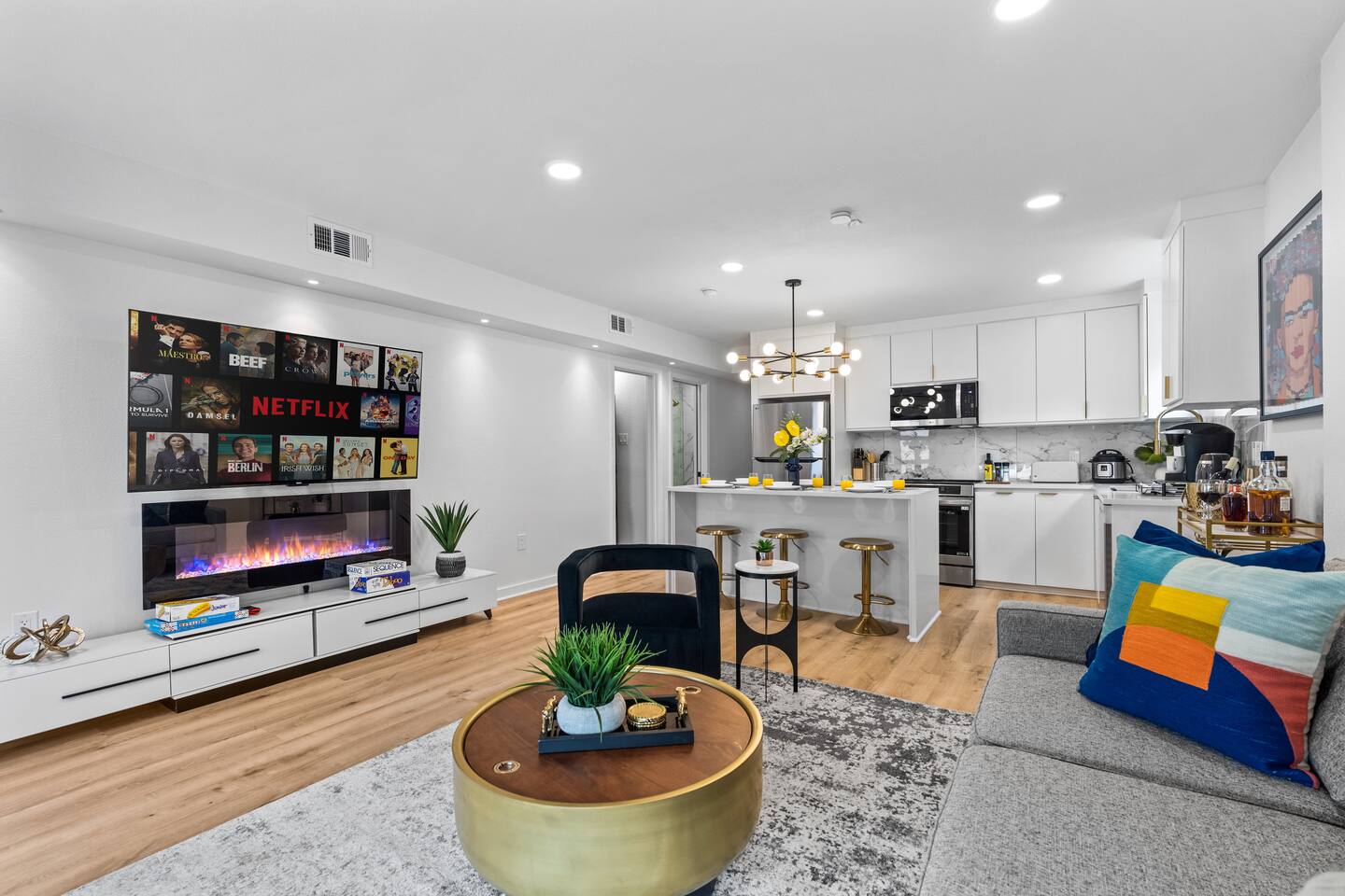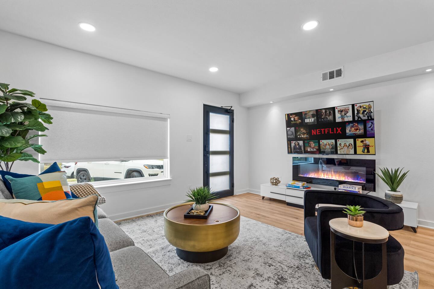 ★ ADDITIONAL ACCOMMODATION ★ Traveling in a larger group, or your preferred dates are already taken? You'll be happy to know that we offer additional accommodation in the city. Please browse our host profile for the complete list of our listings. 📍Please Note – Apartment Living 🏢 This unit is located in a residential apartment building. While the space is usually quiet and peaceful (as mentioned by most of our guests! 😊), there is always a small chance of hearing sounds from nearby units every so often — again, not often at all — just part of apartment living! 🛋✨ It's very rare, but we always want to set the right expectations and appreciate your understanding! 💛 ★ COVID-19 SANITIZATION ★ Health, safety, and well-being of our guests are of utmost importance. For this reason, we use a thorough cleaning process after each check-out. You can feel comfortable knowing that our cleaners follow the complete procedure to ensure that our units are entirely disinfected and sanitized, adhere to coronavirus prevention procedures, wipe all doors and keypads, and keep our environment clean. ★ NO PETS ALLOWED ★ We love those little (and not so little) furry bundles of joy. Sadly, our home is not suitable to accommodate them. ★ NO SMOKING INSIDE ★ Please refrain from smoking inside the home! Any smoking evidence will result in odor removal and furniture cleaning fees. ★ NO PARTIES/EVENTS ★ We kindly ask you to treat our home as your own to preserve its pristine condition for future guests and your return visits. Please respect the community noise ordinance from 9PM to 7 AM. Unauthorized gatherings will be terminated immediately with no refund. Always be respectful of our community and be good neighbors. ★ SECURE PARKING AND EV CHARGING ★ 1) *Optional secure gated parking for one private vehicle (max 9’ width incl. mirrors) available at $9/day ($40 Value). 2) *Optional EV Level 2 Charger available for one private vehicle (max 9’ width incl. mirrors) for a flat fee of $25/day ($45 Value). (Please note this is a Tesla Level 2 EV charger. Guests are responsible for bringing their own compatible adapters. All EV charging fees are the guest’s responsibility and are non-refundable.) ★ ADDITIONAL DETAILS TO NOTE ★ ✔ The unit is located on the second floor, and guests will need to use the stairs to access it, as there is no elevator in the building. ✔ All guests must be listed on the reservation. Per our community guidelines, only two visitors are allowed. Overnight hours start at 11 PM. ✔ It is essential to review our house rules before booking. ✔ Please park trucks and vans on the street; the driveway is for cars and small SUVs only. ✔ Games and activities depicted in the listing may vary and are subject to change based on market availability and demand. ✔ It's Texas! Please keep all the doors shut so little critters won't make their way into the property, and keep the heat out. For same-day, last-minute reservations, please note that the unit may not have been prioritized for immediate preparation, and check-in may be delayed. We kindly ask that you coordinate with the host to confirm your check-in time. We will do our best to accommodate you as promptly as possible. • • Local Guests MUST let us know at the time of booking if additional visitors will arrive during the stay or reservation will be canceled. No exceptions and no refunds. • • Thank you very much. We look forward to hosting you!